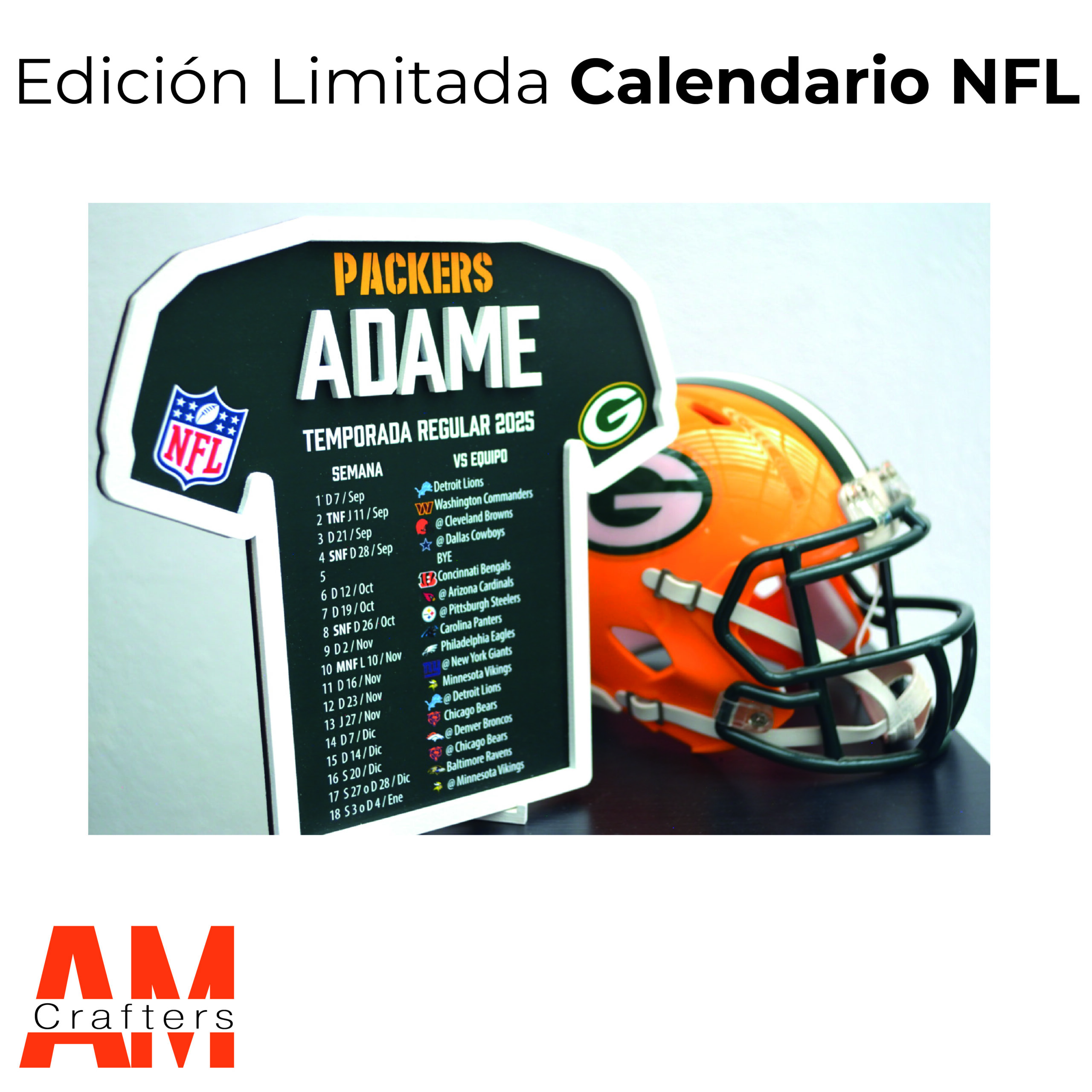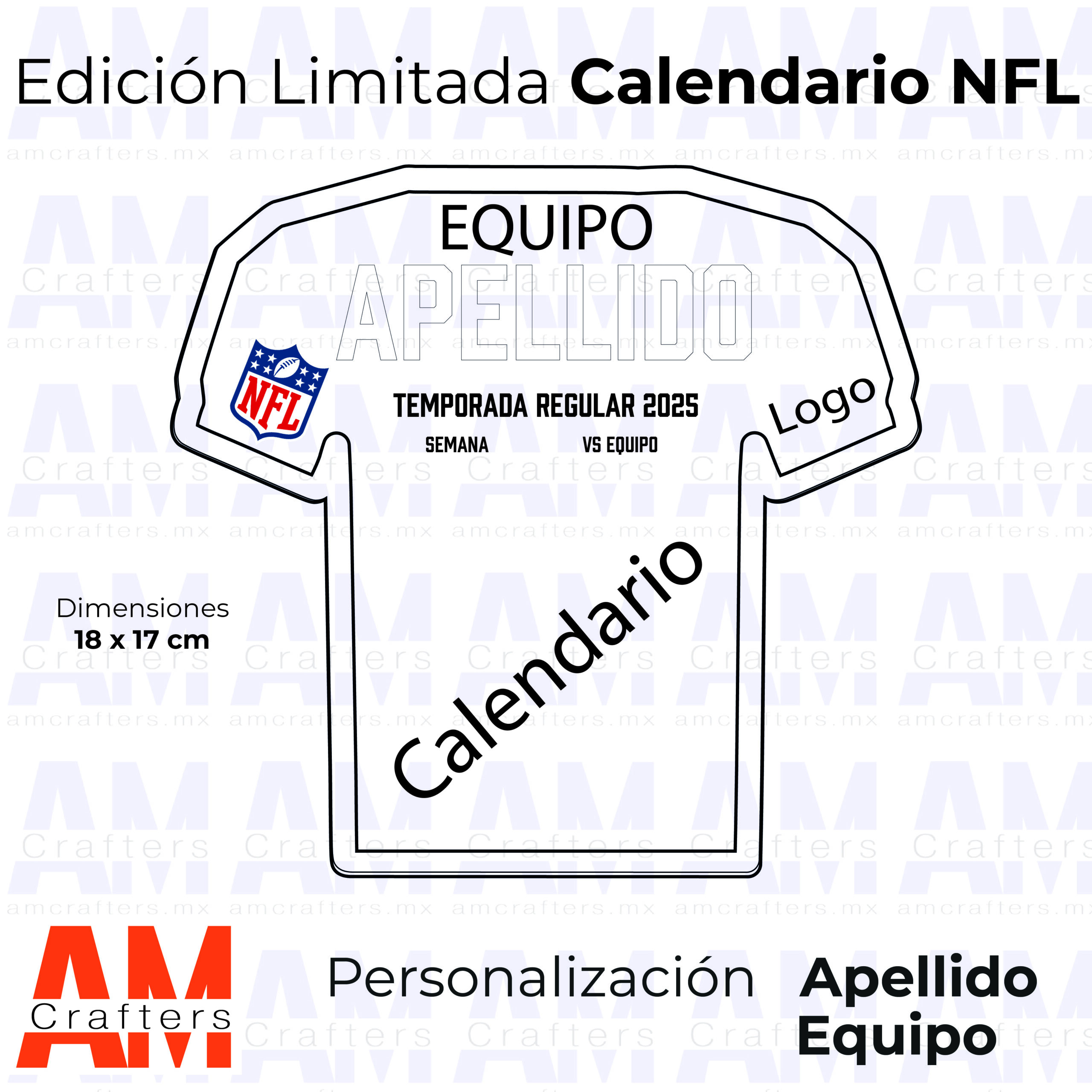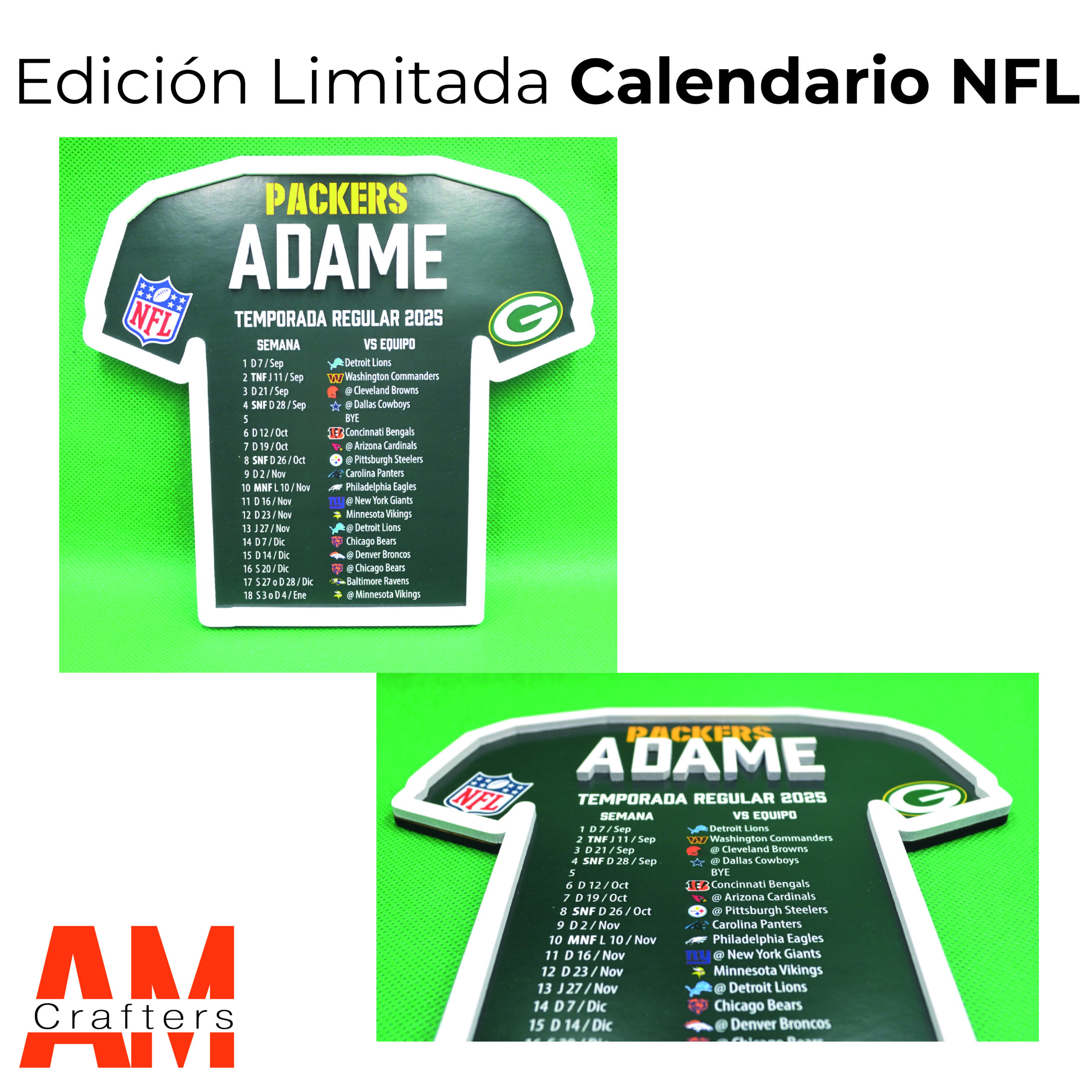 ¡Pero eso no es todo! Personaliza tu calendario con tu apellido, demostrando tu lealtad a tu equipo y añadiendo un toque único a tu espacio. Perfecto para tener en tu escritorio, al lado de la TV o en cualquier lugar donde puedas seguir de cerca la acción de la NFL.