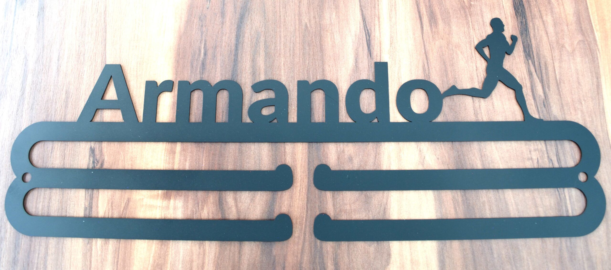 Adorno metálico de Medallero modelo “2 Renglones” para exhibir medallas y completar con el nombre y figura del deporte en corte láser de Acero calibre 18.