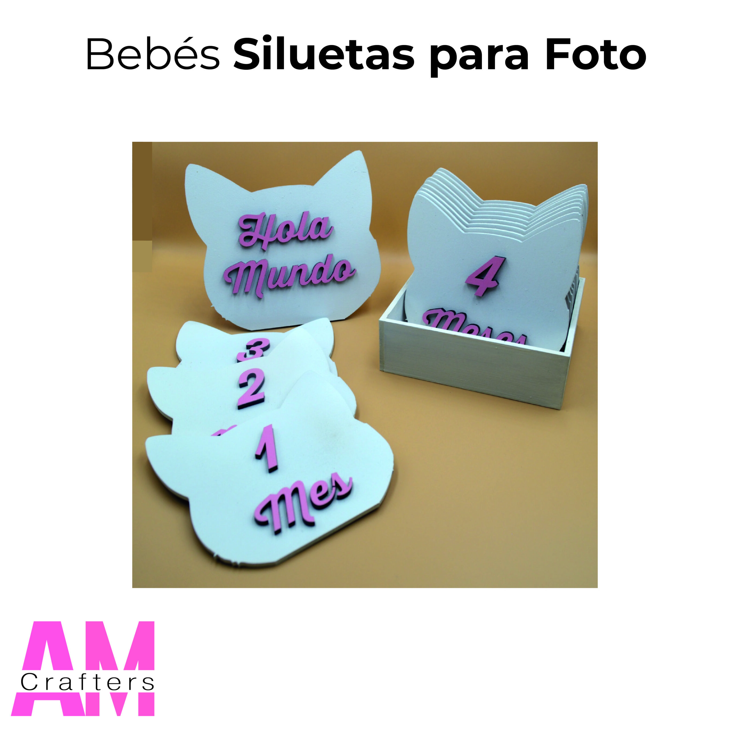 Es un set de 13 siluetas, la primera con la leyenda “Hola Mundo” para sus primeras fotos y luego 12 siluetas para cada uno de los meses de su primer año.
